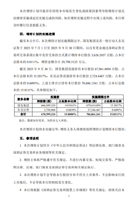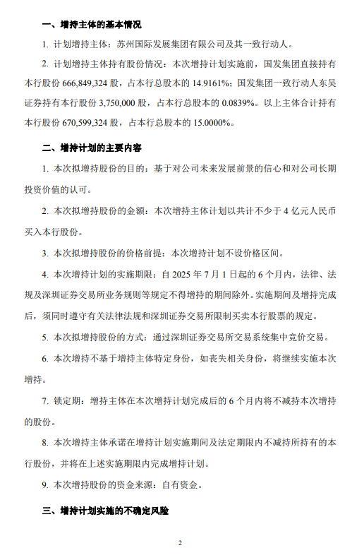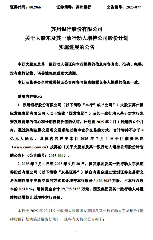 10月9日金融一线消息,苏州银行公告,股东苏州国际发展集团有限公司、东吴证券股份有限公司于2025年7月1日至2025年9月30日间合计增持3626.2万股,占公司目前总股本的0.8111%。