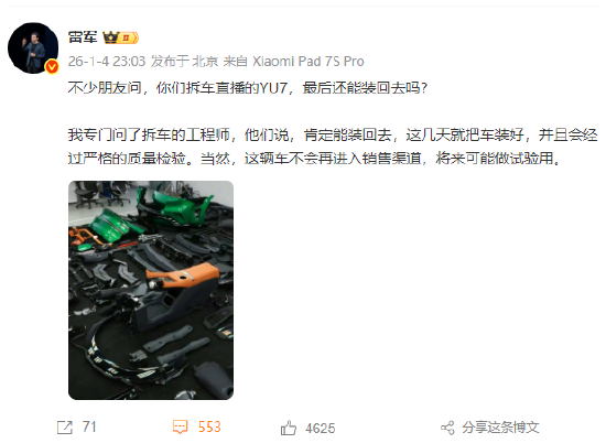 对于这台拆过的YU7如何处理,雷军昨晚发文表示: